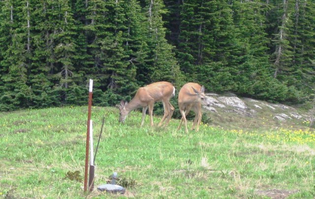 The mule deer at Logan Pass show a conditioned tolerance to humans that we don’t often see on Big Mountain in the adjacent Whitefish Mountain Range. These Glacier mulies aren’t the least bit daunted by the hundreds of visitors to the Logan Pass visitor center less than 30 yards away (behind and next to your photographer).
