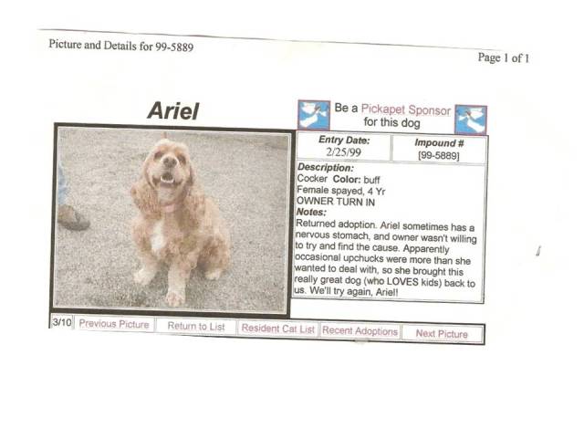 Scoober was a throw-away dog. Her name wasn’t Scoober then, it was “Miss Ariel.” Her previous owner, an elderly woman, perceived her to be a dainty lady-like dog, requiring a title as part of her name. When she proved incapable of being that dainty dog, she was sent to the Missoula Humane Society Shelter in late 1998, around the age of 4. The rap on Miss Ariel, the reason posted for her being given up, was that she “upchucked” too much.