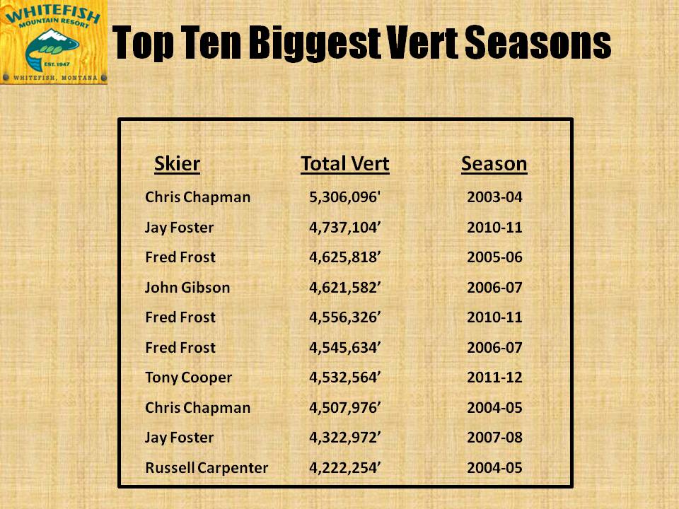 Here are the Top 10 biggest, single-season Vert performances in the history of the Whitefish Mountain Resort’s Vertical Program. Topping the list is local legend, Chris Chapman—Congratulations Chappy! You are the sole member of the 5 Million Feet club!