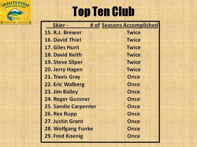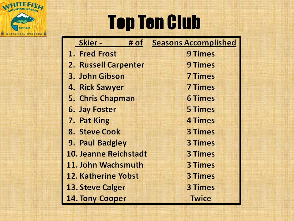 And congratulations to Steve Calger, Kay Yobst and John Wachsmuth for returning to the Top 10! This 2011-2012 Season was a character-builder from the beginning—with it’s delayed opening and slow to get here “La Nina” snowfall. You all earned every bit of it this season.
