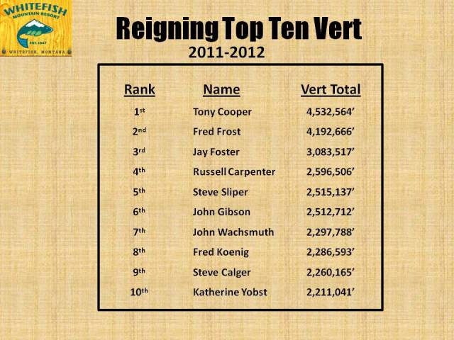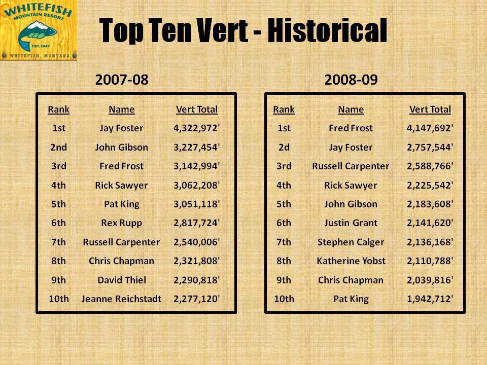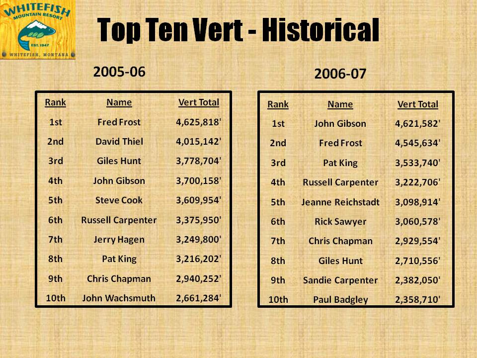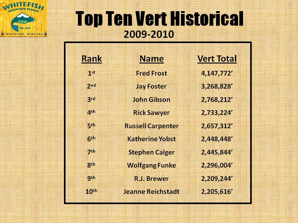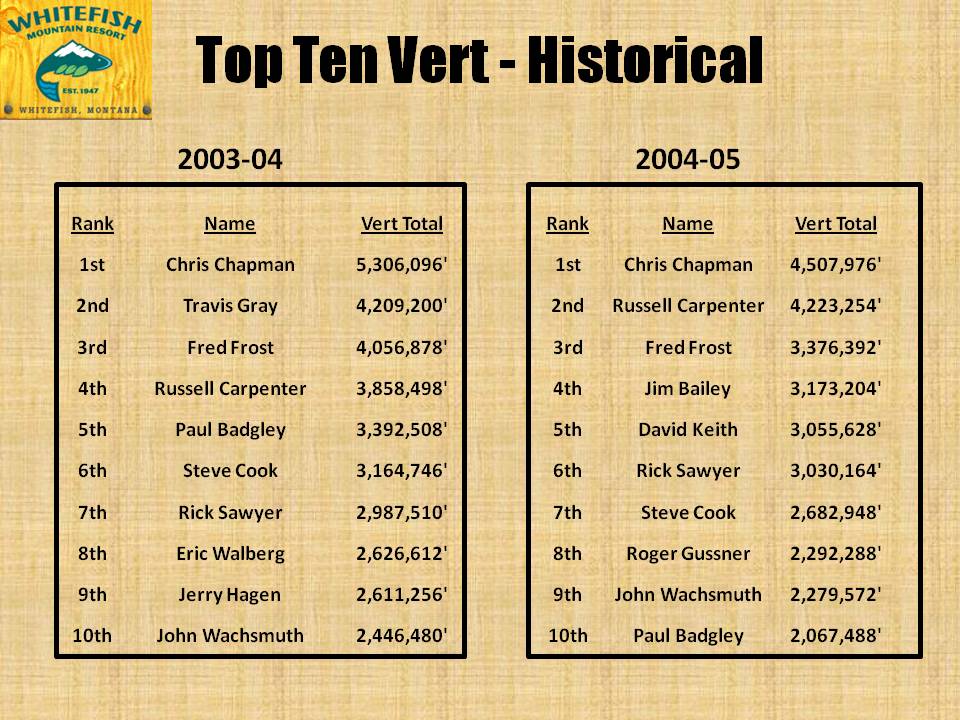 The following information highlights some of the rich, recent history of Whitefish Mountain Resort (known from 1947-2006 as The Big Mountain). This page lists the Overall Top 10 skiers as measured by the resort’s vertical (Vert) program. The vert program, which dates back to Thanksgiving weekend 2003, has been keeping track of who has skied the most (in vertical feet) on a daily basis for nine seasons.