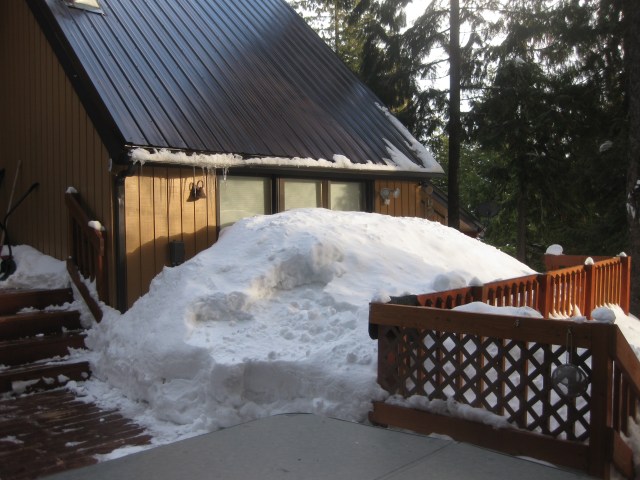 Our living room’s west wall had included an 8-foot wide sliding glass door. The base of which had gotten snowpack condensation-related rot for years. Our vaulted living room ceiling is nice…but the roof right above it is steep. Two inches of snow sloughs off into foot-deep piles on the deck just west of that wall/slider. A couple of days of snow in a row, followed by a slight warm-up, then overnight freeze…and voila, it’s officially a mini-glacier and impossible to shovel. We soon abandon the effort. The result looks like this: