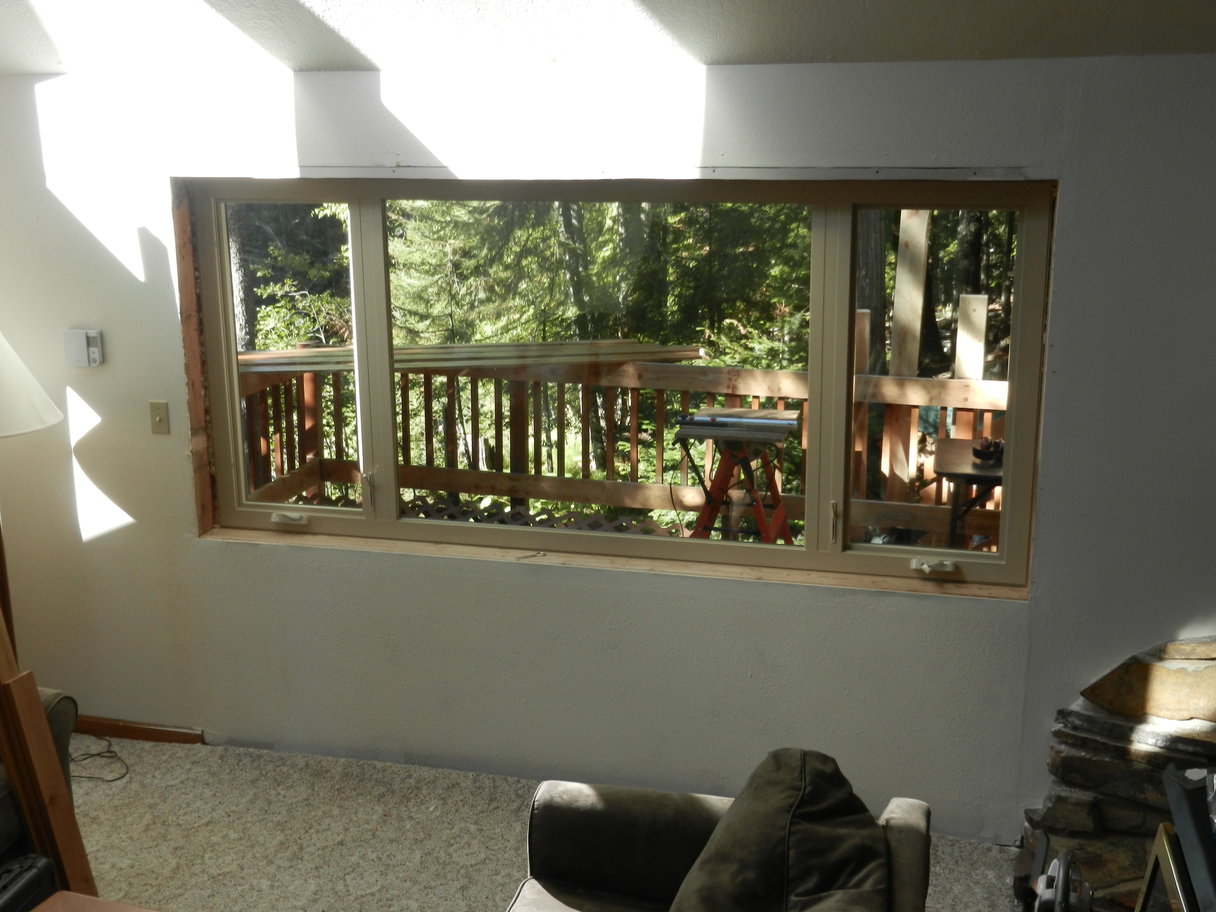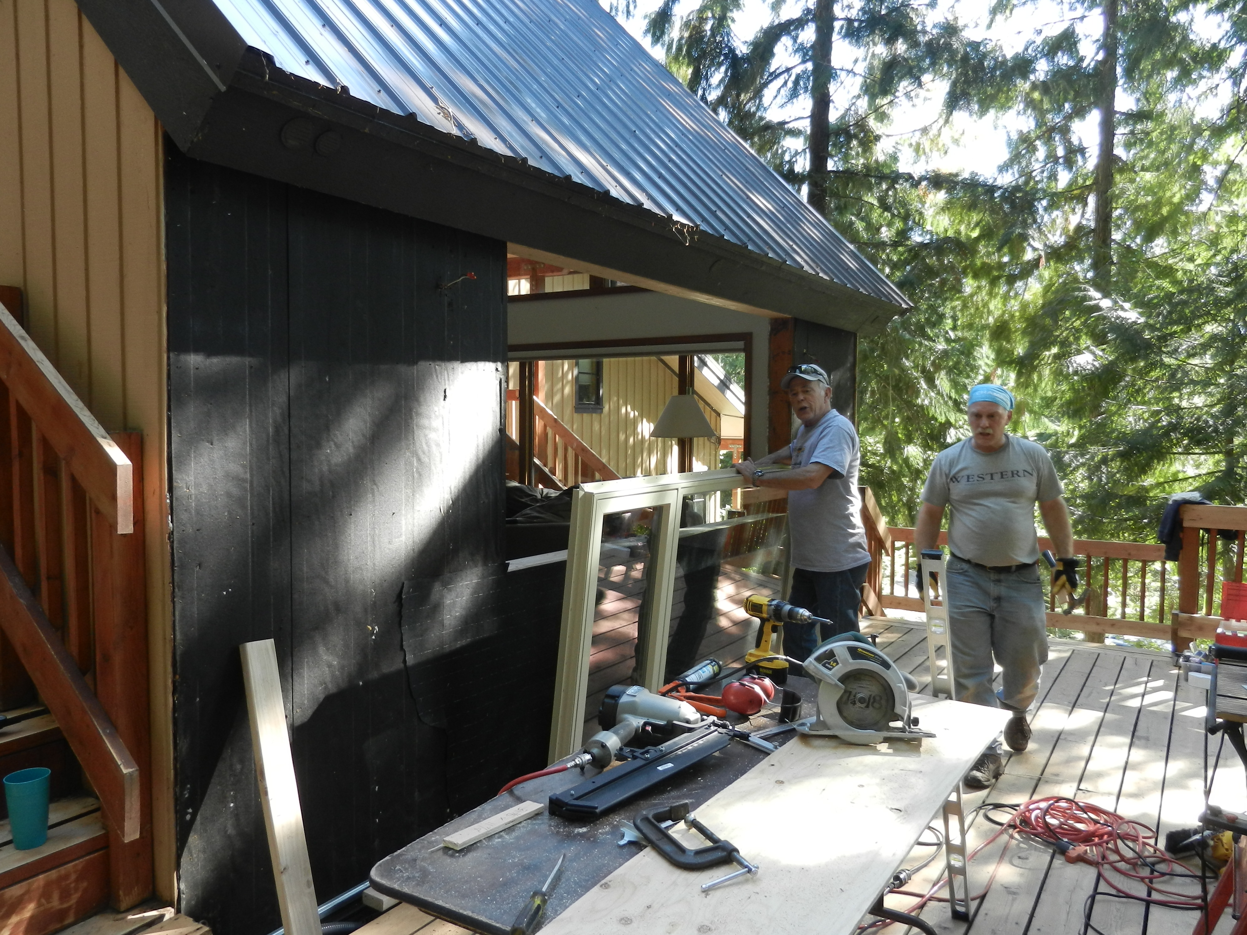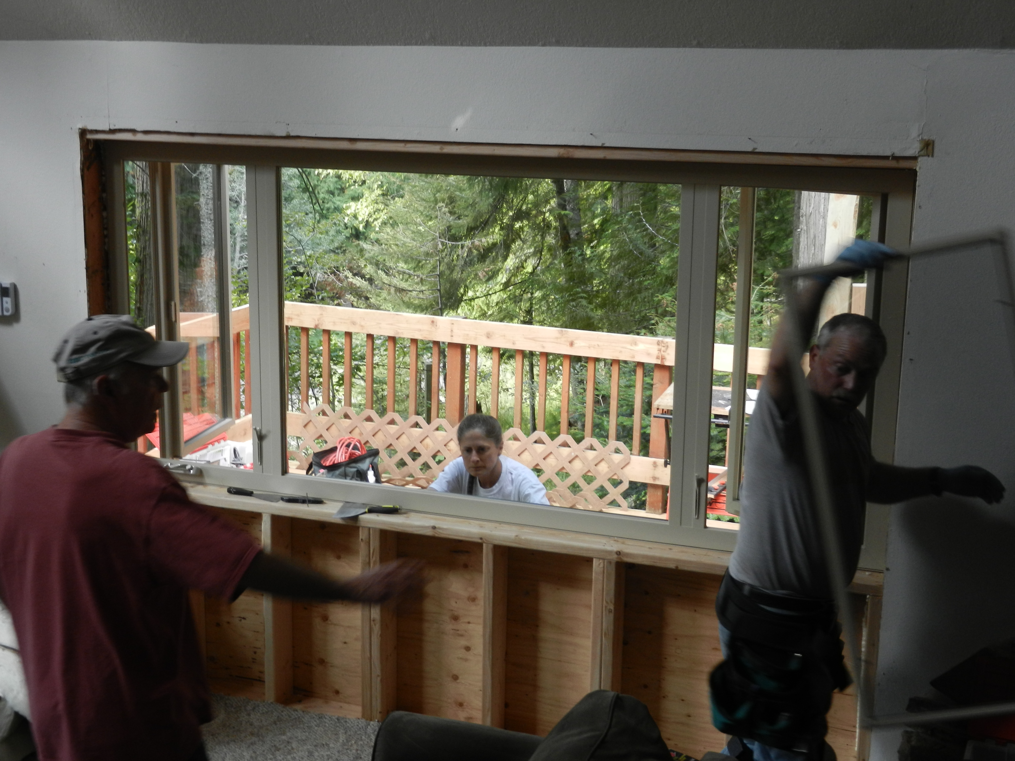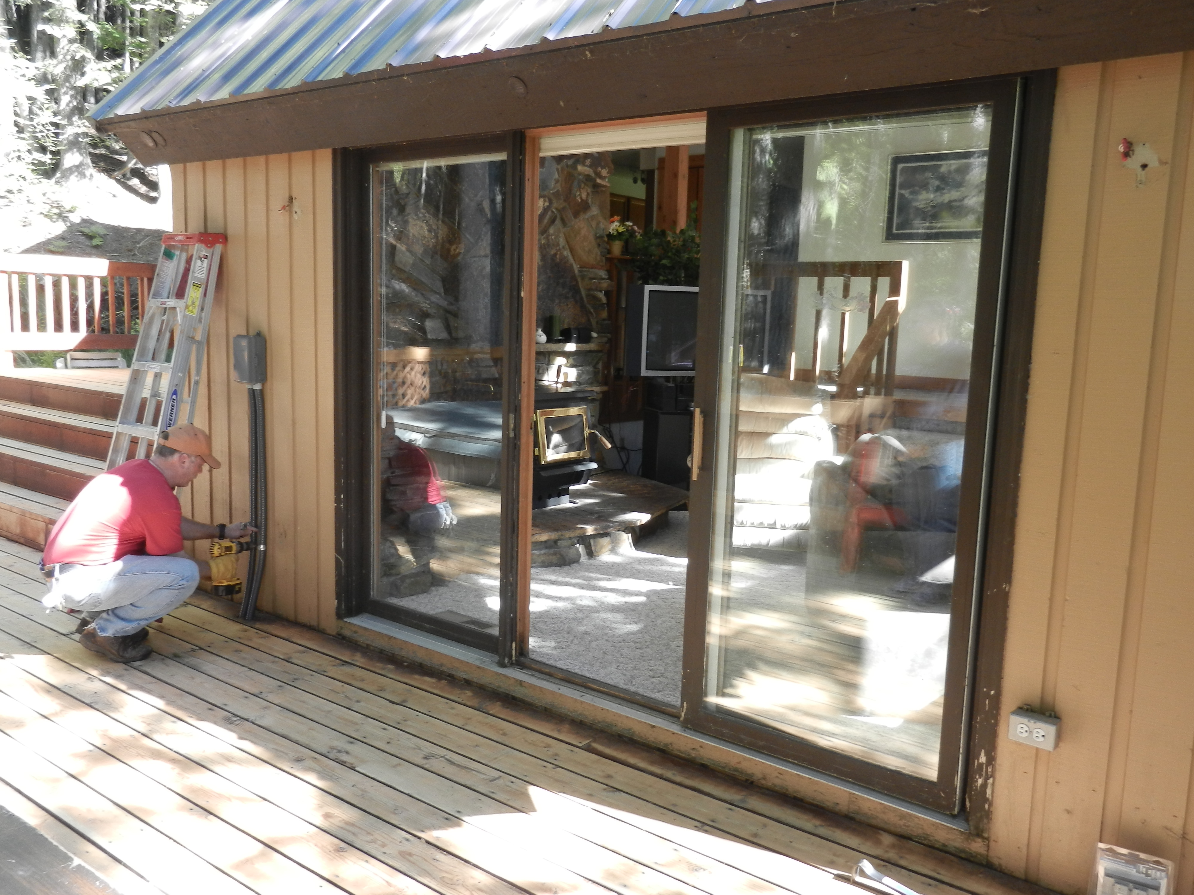 After a couple of seasons of deep, deep snow…and the recent announcement of another upcoming La Nina year (which usually portends deep-snow), we knew we must replace the old, rotted framed slider. So, in comes Kevin Murphy–proud new owner of 21 magnificent acres of Flathead Valley foothill land west of Whitefish.