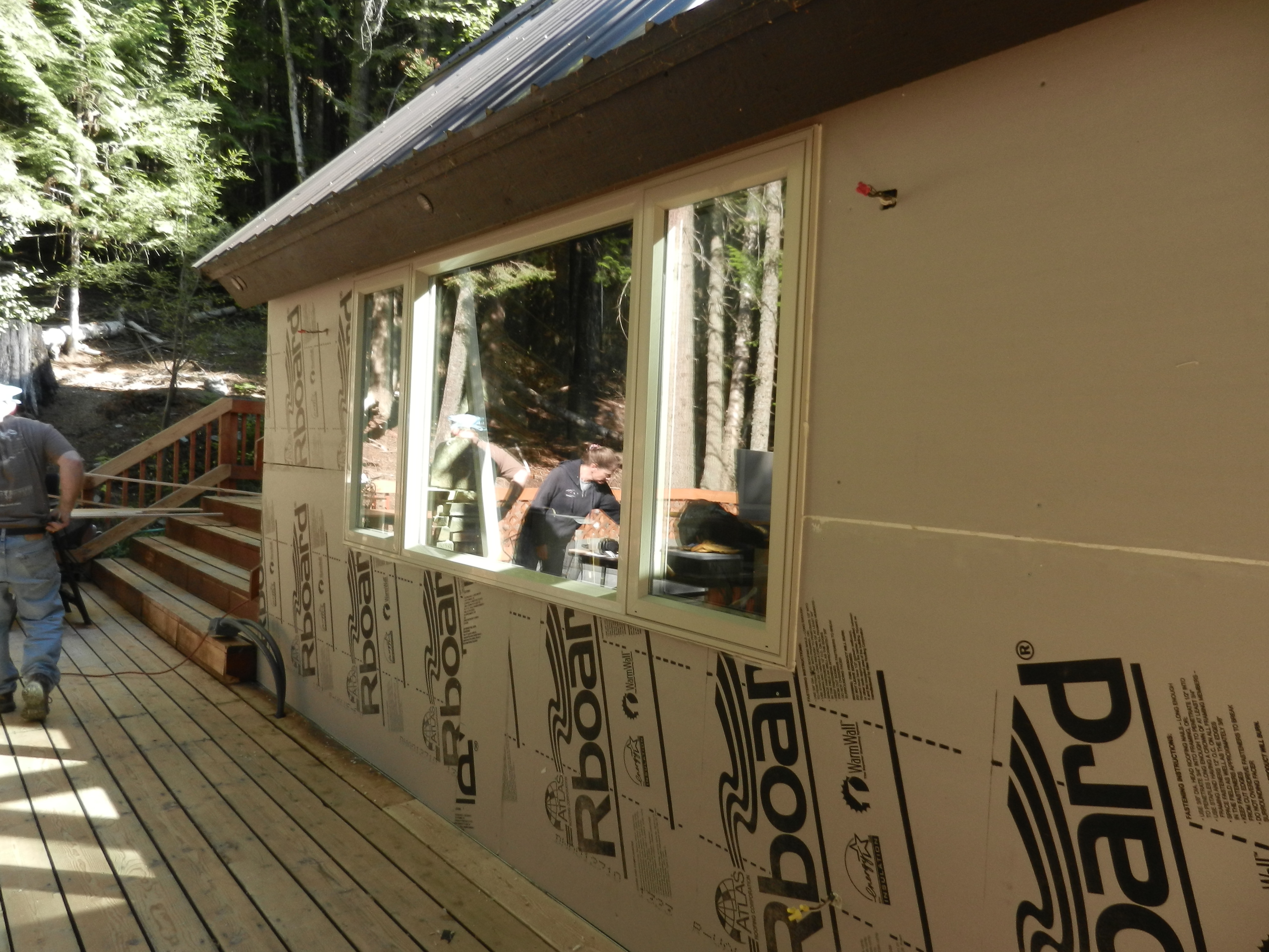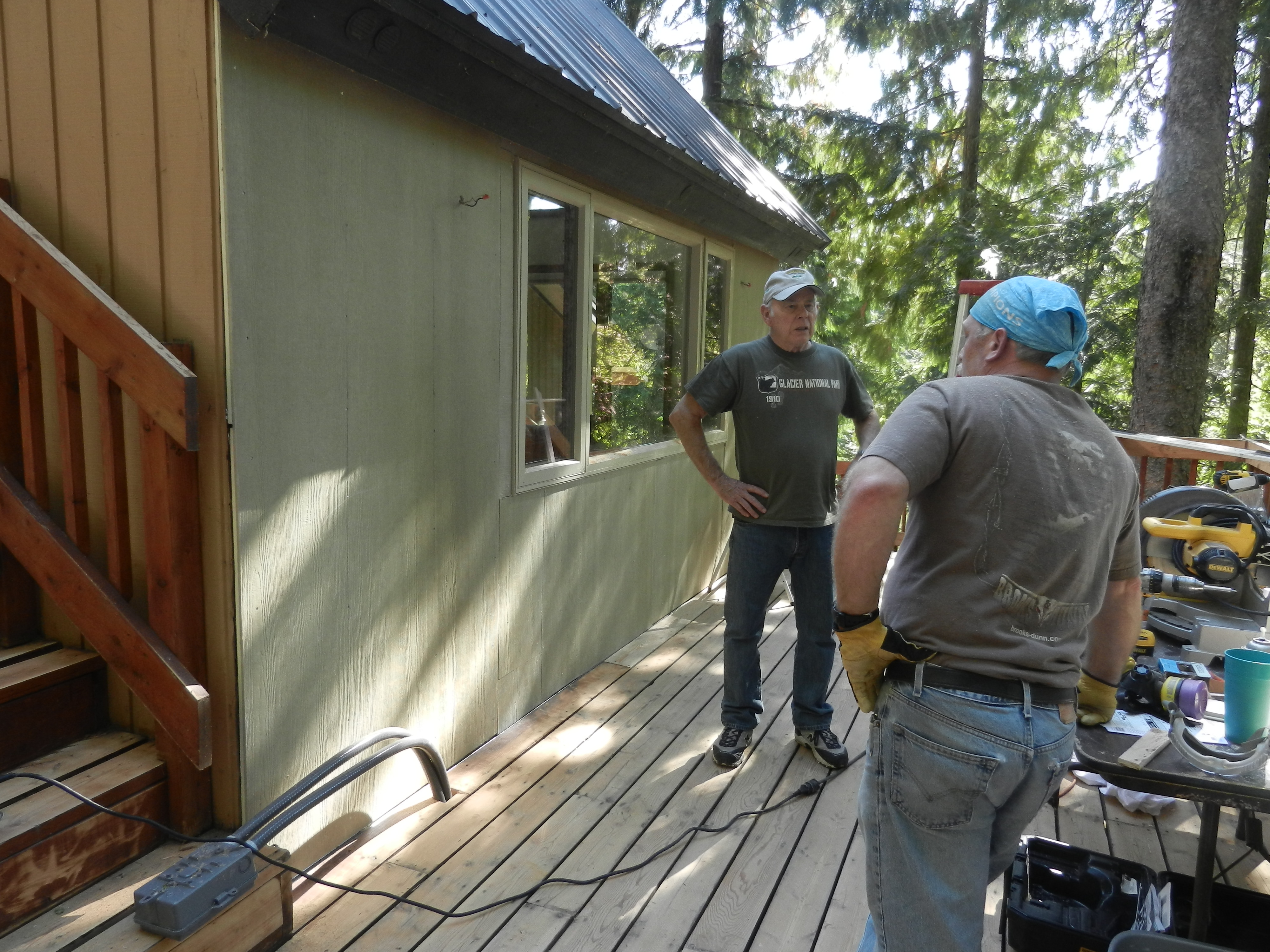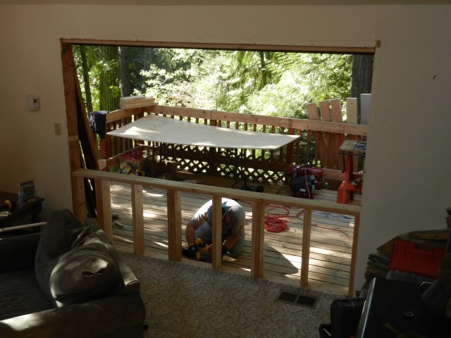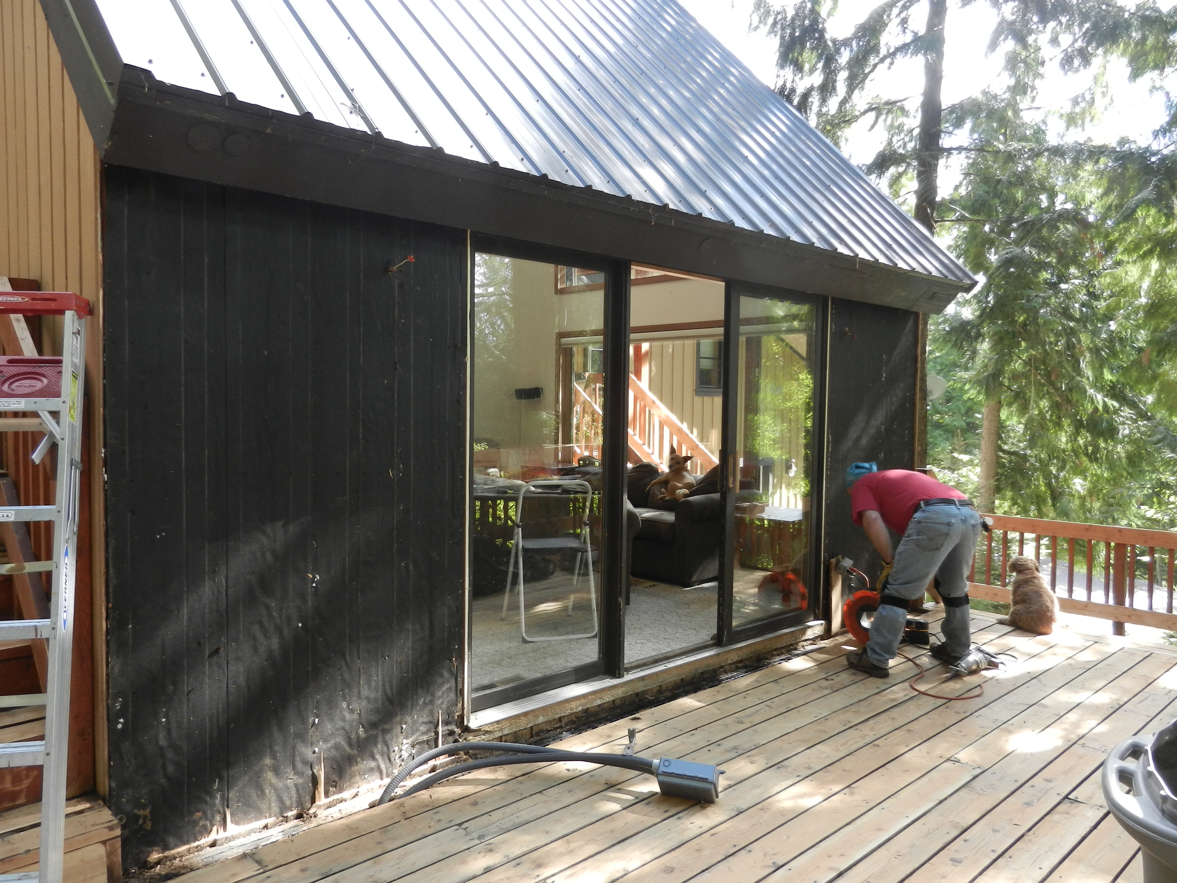 After a couple of seasons of deep, deep snow…and the recent announcement of another upcoming La Nina year (which usually portends deep-snow), we knew we must replace the old, rotted framed slider. So, in comes Kevin Murphy–proud new owner of 21 magnificent acres of Flathead Valley foothill land west of Whitefish.