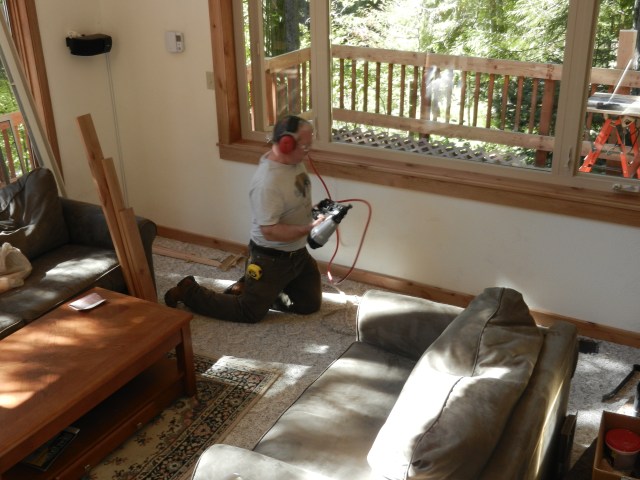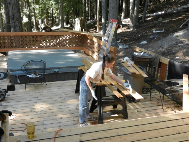 The project was a total “team” effort. In the same sense that the Indianapolis Colts are a team (both with and without Peyton Manning–but they are 0-7 right now). In our case, Kevin played the healthy Peyton Manning role. It couldn’t have been done without him, while the rest of us worked within our abilities. Below, Lynette was staining the alder wood–to be used on the inside trim in a few days.
