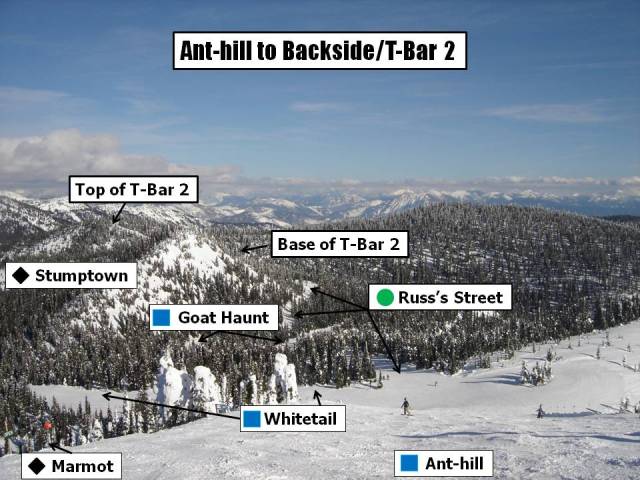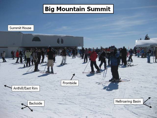 Among the great options at the summit is skiing the Backside (now referred to as the “Northside” on the Whitefish Mountain Resort Trail Maps). If you choose to ski back here and you aren’t yet an expert skier, you will have to navigate the infamous Big Mountain landmark–the “Ant-hill.” The Ant-hill (sometimes referred to as “Fill Slope” on resort publications) is among the most treacherous parts of Big Mountain. It isn’t super-steep, but it’s steeper than novices are ususally comfortable with, and especially daunting when crowded. The more crowded it gets, the icier and bumpier it becomes, making it even more daunting for beginners. It gets its nick-name from the all of the bustling activity of skier’s and riders competing for limited space–just trying to safely get to somewhere better. All that activity looks like an ant-colony on snow.