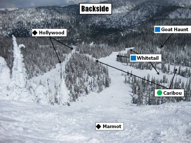 Here you can just begin to see how wide open Ptarmigan Bowl and the Big Face are. You can also see the open glades of Good Medicine, Langley, and the (Chairs) 5/4 line.