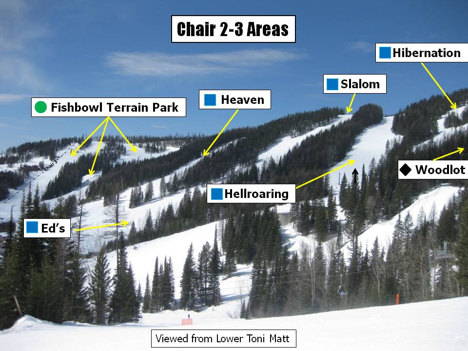 Seen another way, here are the Chair 2 and Chair 3 areas viewed from lower Toni Matt. At far left is the Fishbowl Terrain Park area, serviced by Chair 3 (a three person fixed lift), visible on your left. The right side of the photo shows you the Chair 2 area from about mid-way down–the tops of Slalom and Heaven are visible from their perch near the Hellroaring/Home Again Junction.