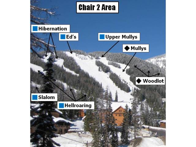 This is the original Big Mountain terrain, where the mountain’s pioneers-Ed Schenk, Lloyd “Mully” Muldown, and others took skiers uphill via rope tows and such. Consequently, these chair 2 area runs bear the names of these men. We are all eternally indebted to them. They saw the potential for alpine abundance and acted on it. Signature runs are Eds, Mully’s, Hellroaring and Heaven.