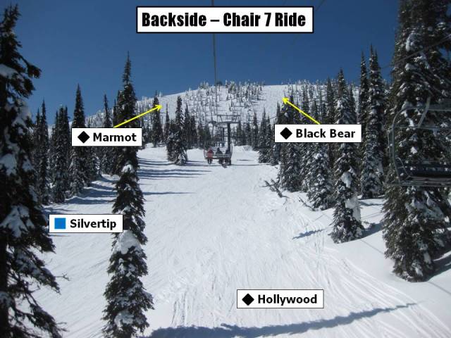 The Backside and T-Bar 2 area includes all of the terrain culminating at Chair 7 (a high speed quad which services 1216 vertical feet of terrain). Most of this terrain is primarily North-facing. This terrain is the best bet for keeping good snow when we’ve had variable conditions on the frontside. Here below is the view looking north from the top of Marmot. Hollywood follows the Chair 7 lift-line.