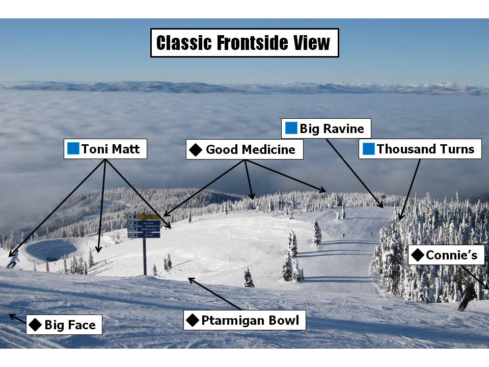 The Frontside of Big Mountain is, unique among North American resorts, generally south-facing. Thus, it is subject to temperature fluctuations and regularly changing snow conditions than the naturally more shaded North-facing areas. The frontside gets a healthy dose of the sometimes rare ‘sunlight’ on the Mountain.