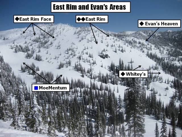 The East Rim and Evan’s Heaven areas include much of the signature expert terrain on the mountain. The deeper the snow, the better this terrain gets. And while that is true of just about everywhere on the mountain, the East Rim and Evans areas tend to keep good snow a hair longer than the more direct routes back down to the main village.