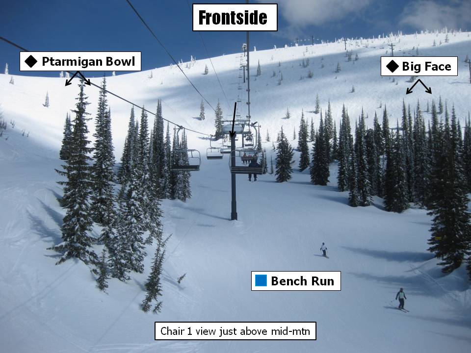 The seven and a half minute, 2084 vertical feet, ride up Chair 1 gives you great views of some of the frontside signature runs–Ptarmigan Bowl and the Big Face are foremost among them.