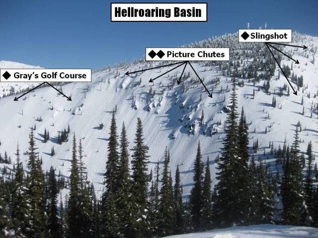 The last great option off the summit is Hellroaring Basin, or the “West Bowl” as it is sometimes referred, includes all the terrain serviced by Chair 8. This terrain is typically the last terrain opened up for skiing by the Resort–both in terms of the season, as snowpack deepens enough for safe skiing (usually by Christmas), and in daily terms, since avalanche control is paramount here. It isn’t uncommon, for the West Bowl to not open up after a significant snowstorm, until the Ski Patrollers get the blasting done–usually by mid or late morning.