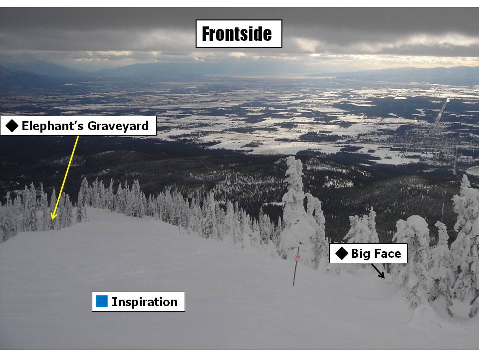 And while you are skiing the classic frontside runs, other folks are undoubtedly skiing down Inspiration–aptly named because of the spectacular views looking down on Whitefish and the rest of the Flathead Valley. Inspiration gives access to several mountain classics, from Elephant’s Graveyard, No Name, Cal’s Country, Haskill’s and Elkweed off the left side of the Inspiration ridgeline; to the Big Face and Langley off of skier’s right.