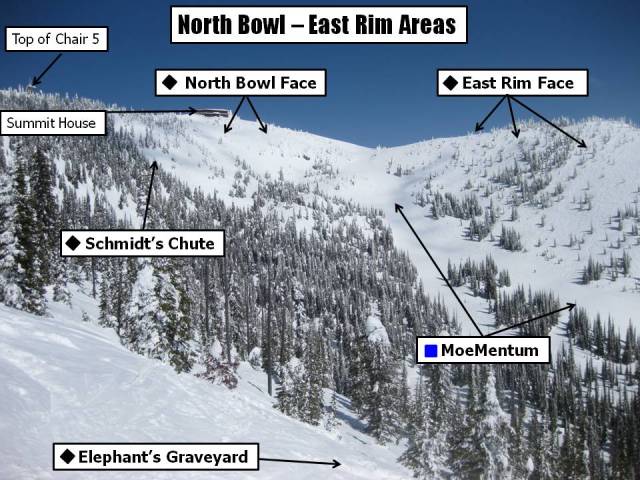 Another option off the Big Mountain Summit is the North Bowl. The North Bowl Face is the terrain just below the deck of the Summit House. Schmidt’s Chute is just west of the North Bowl face, accessed from the start of the cat-track to Inspiration, just below and south of the Top of Chair 5. These runs, along with the East Rim Face, Nose, and Whitey’s, all feed into MoeMentum. MoeMentum is named for 1994, Lillehammer Olympic Gold Medalist, Downhiller and Big Mountain veteran, Tommy Moe.