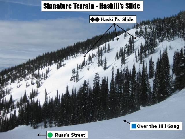 After skiing out of the North Bowl, East Rim, or Evan’s areas, once you pass the MoeMentum – Russ’s Street Junction, look up on your right, and you will see the Big Mountain’s most revered, signature run–Haskill’s Slide is the longest, double-black diamond, steep run on the mountain. Haskill’s is a right of passage for all budding experts.