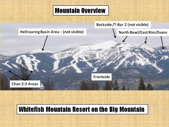 The mountain, for simplicity’s sake, consists of five main areas–the Chair 2 and Chair 3 areas on the left, the frontside, backside(+T-Bar 2 area), the North Bowl/East Rim/Evan’s areas, and Hellroaring Basin (also commonly referred to as the West Bowl).