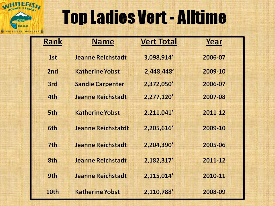 And, in the interests of completing the record, for historical comparisons, below are the Top 10 all-time vert season performances by the Ladies–clearly this isn’t the first “rodeo” for either Kay or Jeanne. The top Ladies of Big Mountain show up every year. My hat is off to them!